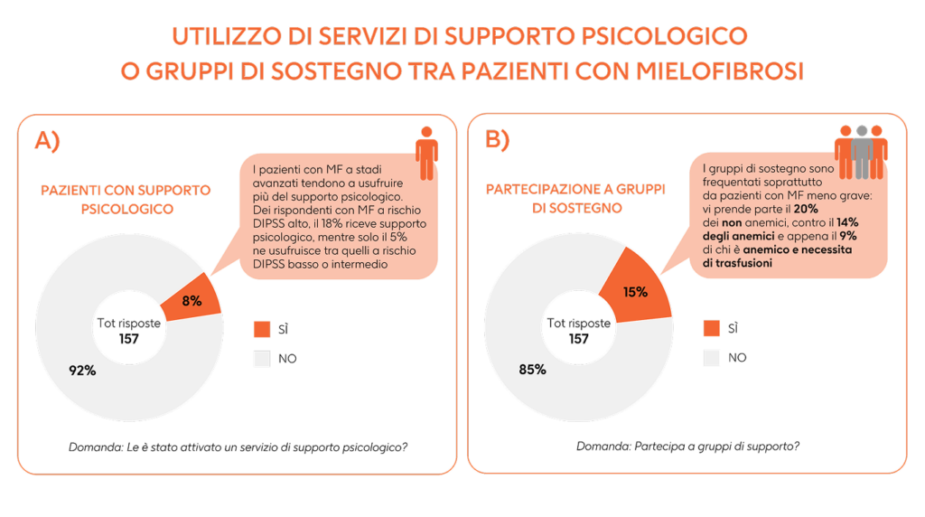 Nel questionario online diffuso con il supporto dell’Associazione Italiana Pazienti con Malattie Mieloproliferative (AIPAMM), solo l’8% dei 157 pazienti con MF che hanno risposto ha dichiarato di usufruire di supporto psicologico (Figura 1.A), e il 15% di partecipare a un gruppo di sostegno (Figura 1.B). Questi numeri evidenziano come l’accesso al supporto psicologico sia purtroppo ancora molto limitato, segno che l’offerta va potenziata e resa più visibile.